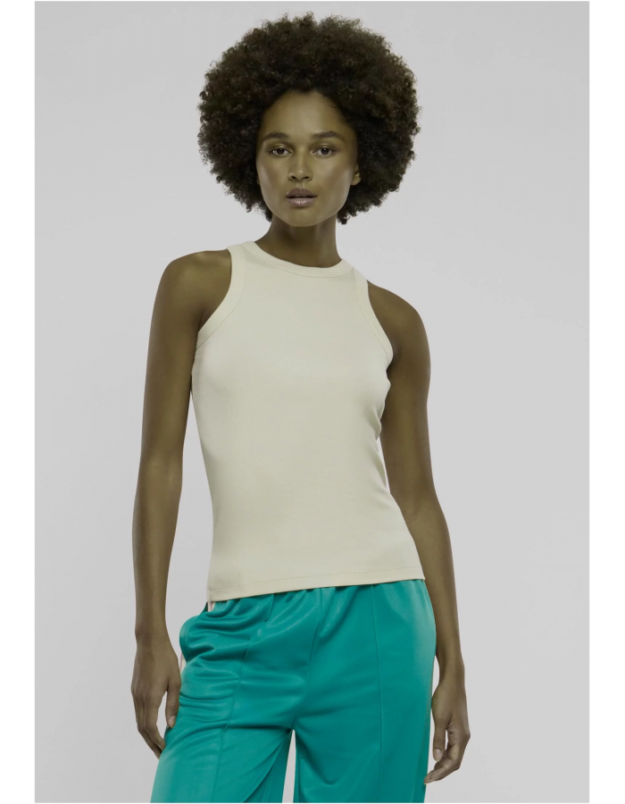 Go for sporty chic with the Ladies Racer Back Rib Top from Urban Classics. This slim-fit top is characterized by its dynamic racerback design and offers a body-hugging silhouette. Made from a blend of 95% cotton and 5% elastane, it promises both comfort and a perfect fit. The ribbed texture and ribbed cuffs and neckline give the top an additional fashionable touch. Ideal for sporting activities or as part of a relaxed leisure outfit, this top offers functionality and style in one.