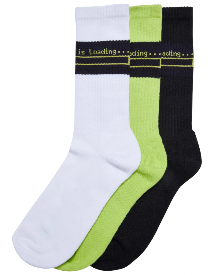 This triple set contains three pairs of socks with a contemporary design. The shaft includes a "is loading..." design motif. The pictured loading bar is empty on one side and filled on the other, which is placed under the “Urban Classics” lettering. For extra wearing comfort the fabric of the shaft is ribbed and it features a small cuff. The skin-pleasing material of the socks consists of cotton, polyester and elastane. They are available in four sizes.